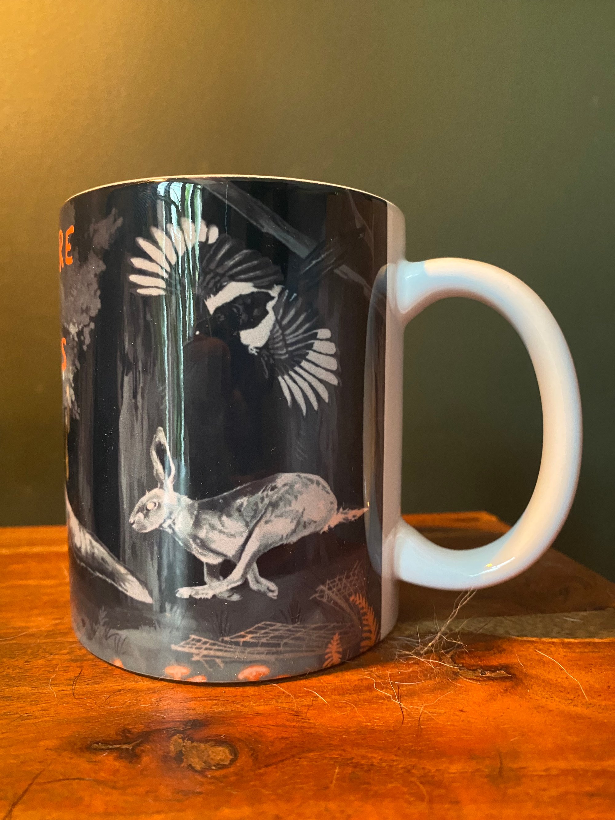 Things we love to see! Some of our favourites on a mug! Badger, fox, hare and magpie with smashed traps and bioluminescent fungi! Thank you to Cowpigeon for creating this for us